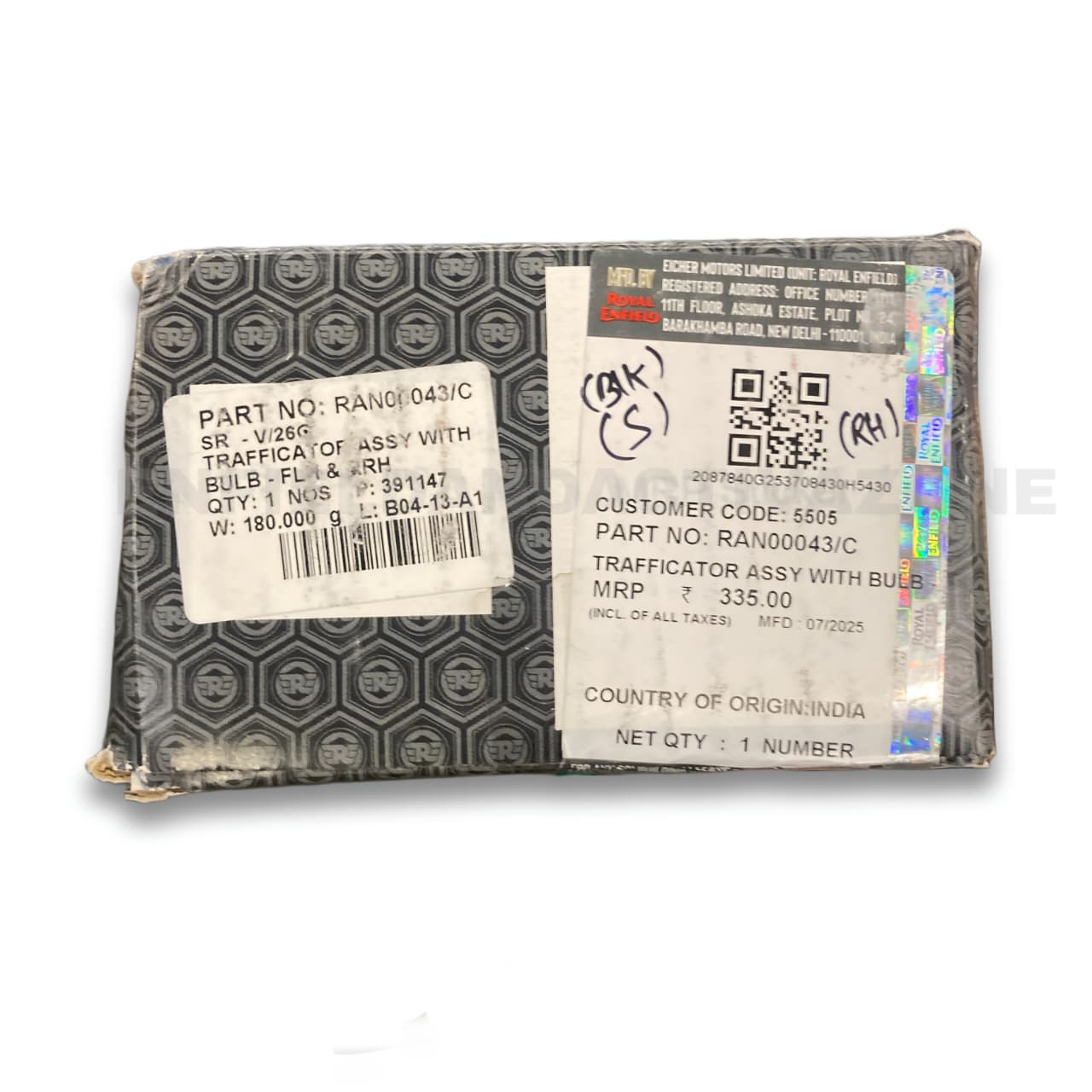 The RAN00043/C Trafficator Assy is a complete winker unit designed for durability and high visibility. It comes fully assembled with a blacked-out housing, a clear or amber-tinted lens (depending on specific model year), and a pre-installed 12V 10W halogen bulb.