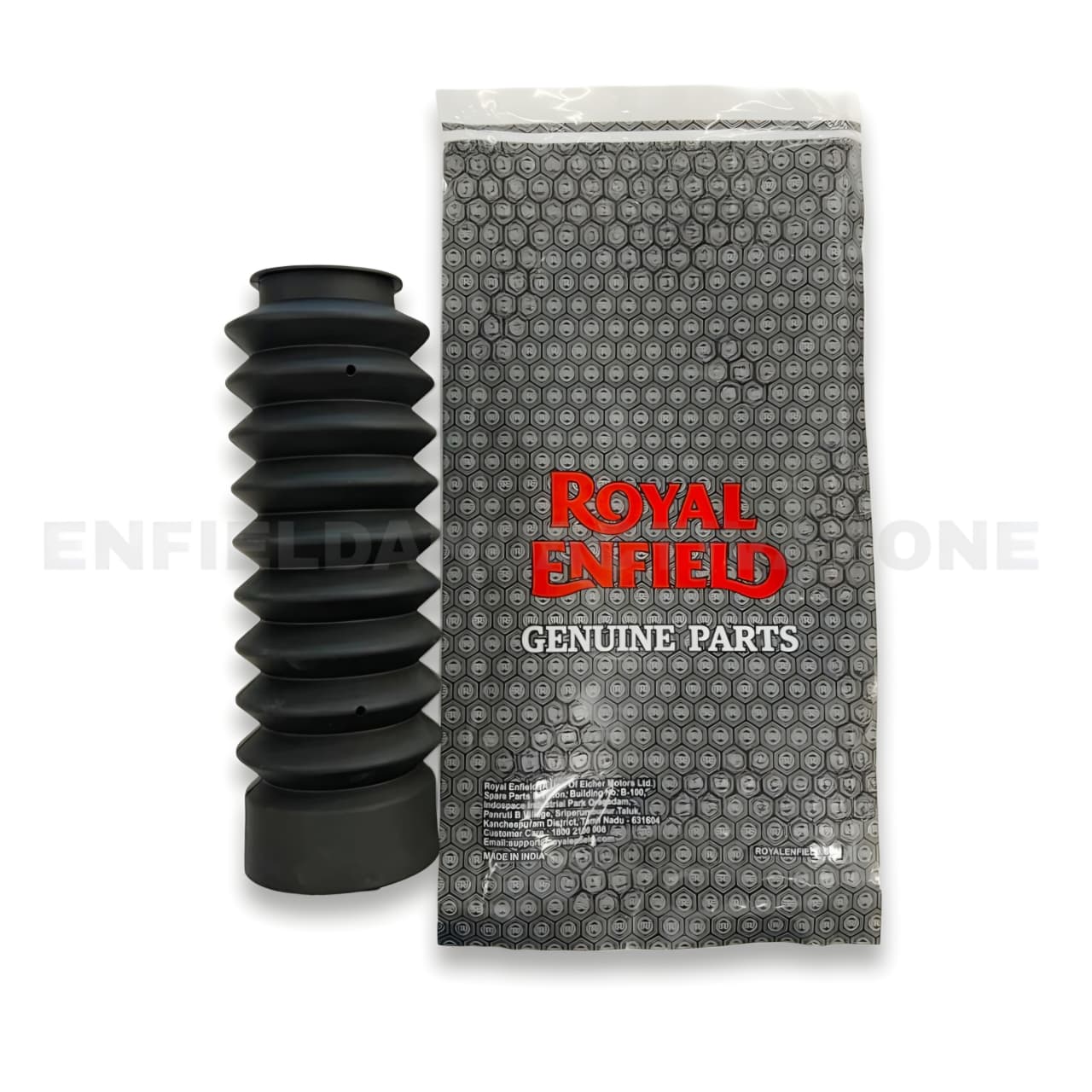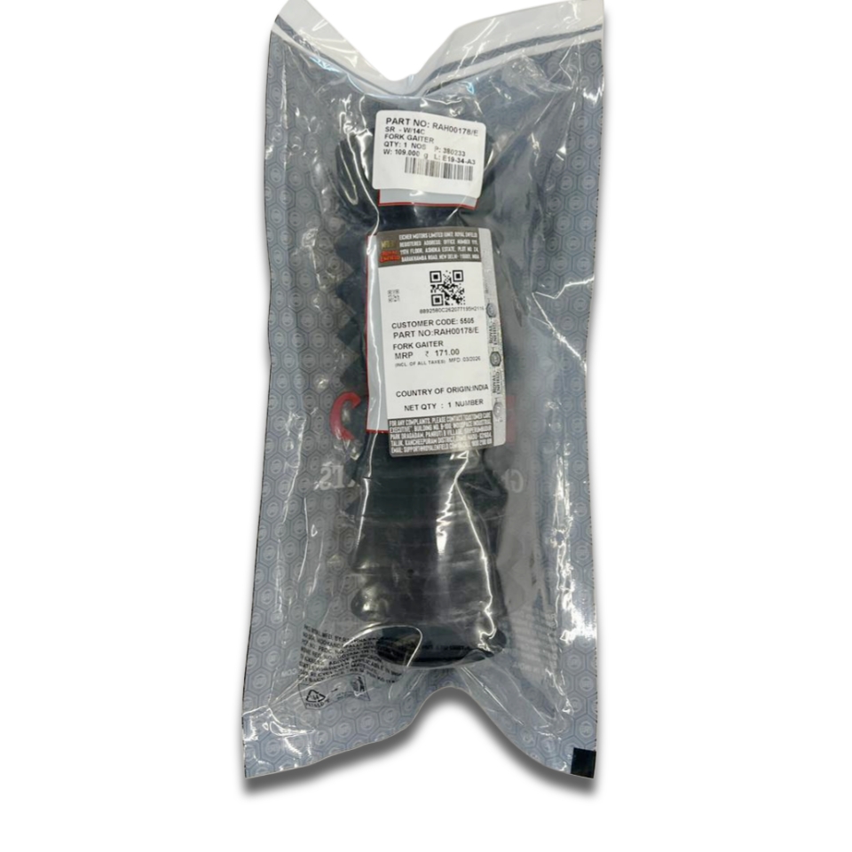 The RAH00178/E Fork Gaiter is an official Royal Enfield accessory engineered to fit the 41mm front forks of the Hunter 350 perfectly. Unlike universal gaiters, this part is designed to stay in place during full suspension travel without bunching or slipping.